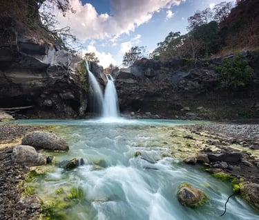 Air Terjun Mangku Sakti yang terletak di kaki Gunung Rinjani, tepatnya di Desa Sajang, menawarkan pesona alam yang sangat unik dan berbeda dari air terjun pada umumnya berkat aliran airnya yang berwarna putih kebiruan (toska) akibat tingginya kandungan belerang alami. Daya tarik utama destinasi ini bukan hanya pada jatuhan airnya, melainkan pada formasi bebatuan cadas di sepanjang aliran sungai yang terukir alami oleh erosi air selama ribuan tahun, menciptakan lanskap ngarai berlekuk-lekuk yang sangat artistik layaknya pahatan abstrak. Perpaduan antara air belerang yang berkhasiat bagi kulit, tebing batu putih yang memukau, dan vegetasi hutan yang asri menjadikan Mangku Sakti sebuah mahakarya geologi yang sering dijuluki sebagai salah satu air terjun paling eksotis dan fotogenik di Lombok Timur.