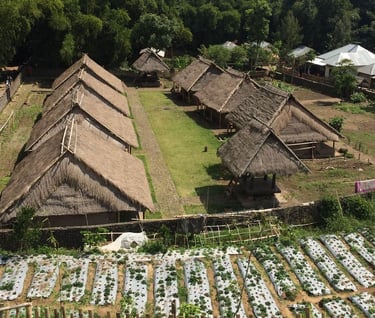 Pemandangan tujuh rumah adat kuno (Bale Beleq) beratap jerami yang tersusun rapi dan simetris di tengah hamparan lembah hijau, berlatar belakang dinding tebing Bukit Pergasingan yang menjulang gagah. Suasana sering kali dihiasi kabut tipis yang turun perlahan, menciptakan panorama eksotis yang memadukan keaslian arsitektur masa lalu dengan kemegahan alam pegunungan Rinjani.
