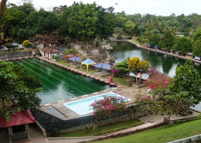 pemandangan alam hijau yang asri dan menenangkan, berupa lembah subur, pepohonan rindang, serta perbukitan khas Lombok Timur yang mengelilingi area kolam.