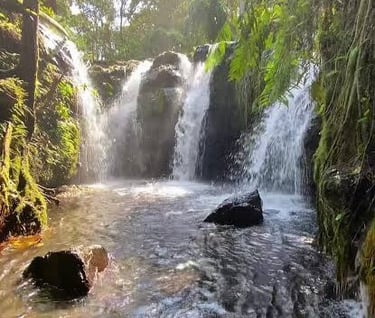 Kolam pemandian dengan air sebening kristal yang memantulkan bayangan pohon-pohon beringin purba di sekelilingnya, menciptakan atmosfer hutan yang teduh, lembap, dan sedikit berkabut yang menenangkan jiwa.